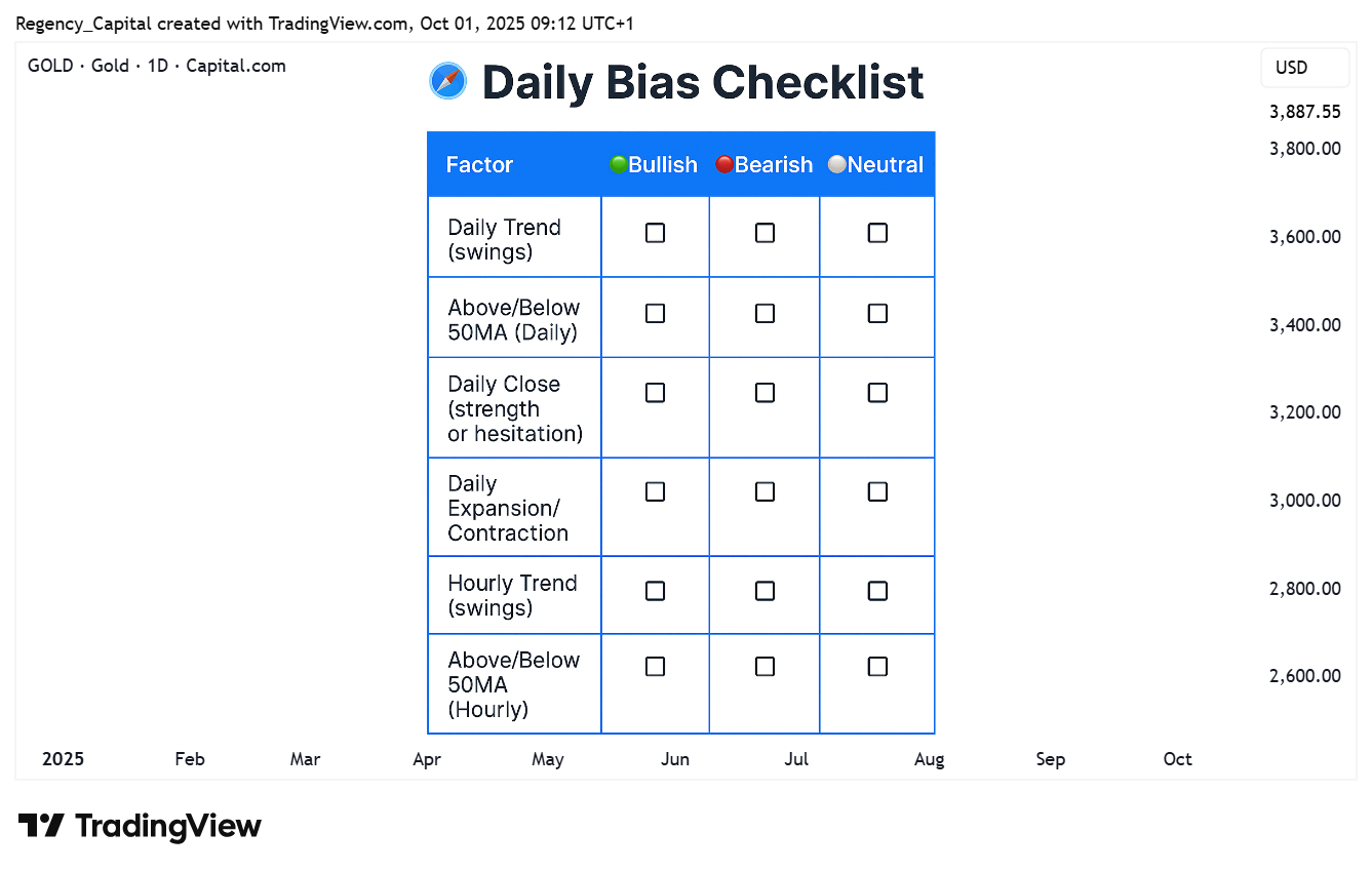 每日偏向並不是預測市場將收在哪裡,而是幫助你在 5 分鐘走勢混亂時保持紀律。日線提供「氣壓」,小時圖提供「順風」,兩者結合為交易提供方向。當它們一致,你就擁有清晰度;當它們背離,你要麼調整,要麼觀望。