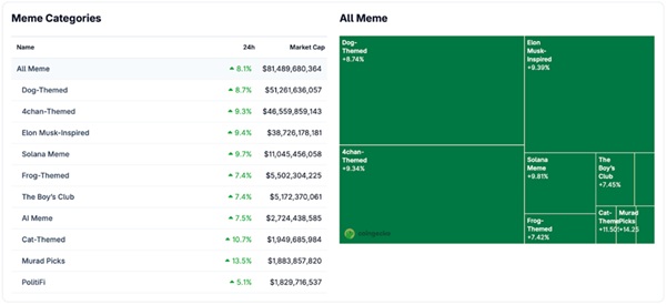 更广泛的市场亦随之上涨,周二录得3.88%涨幅,并在周三欧洲开盘前再涨0.57%。动能迅速传导至Meme币,推动其总市值24小时内大涨8%,突破 810亿美元,交易量在同一时期也达到 88亿美元。