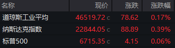 道琼斯工业平均指数、标普500指数和纳斯达克综合指数均实现连续第五个交易日上涨,并刷新历史收盘纪录。道指收涨0.17%至46519.72点,标普500微涨0.06%至6715.35点,纳指表现最为突出,上涨0.39%至22844.05点。