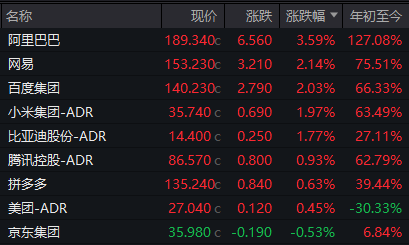 中概股整体走强,纳斯达克中国金龙指数上涨1.06%。热门个股中,霸王茶姬涨5.66%,阿里巴巴涨3.59%,蔚来涨3.14%,百度涨2.03%。中概股ETF同步上扬,Direxion三倍做多中国ETF(YINN)涨2.68%,iShares MSCI中国ETF(MCHI)涨1.12%。