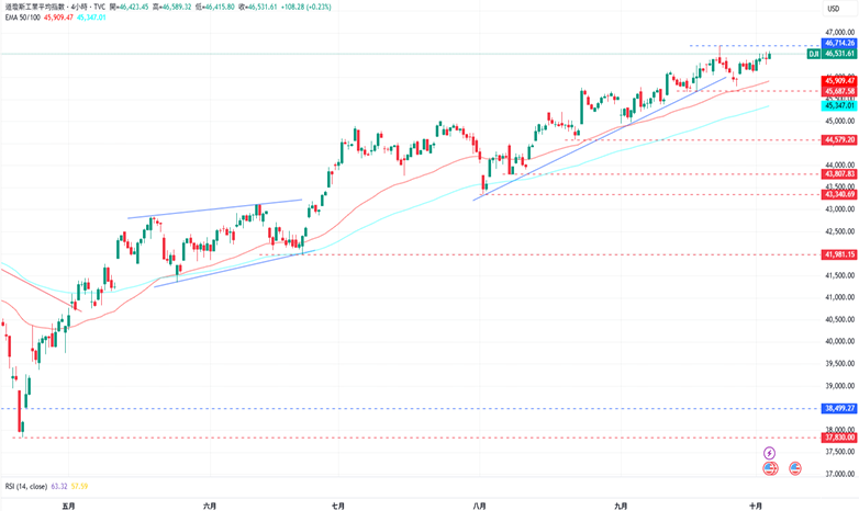 受下方EMA50均线支撑,道琼指数稳定的上涨。上涨方面,道琼指数目前的阻力为9月23日高点46714点,再来是47000点水平。下跌方面,道琼指数接下来的支撑为9月26日低点45785点,接着为9月10日低点45380点。