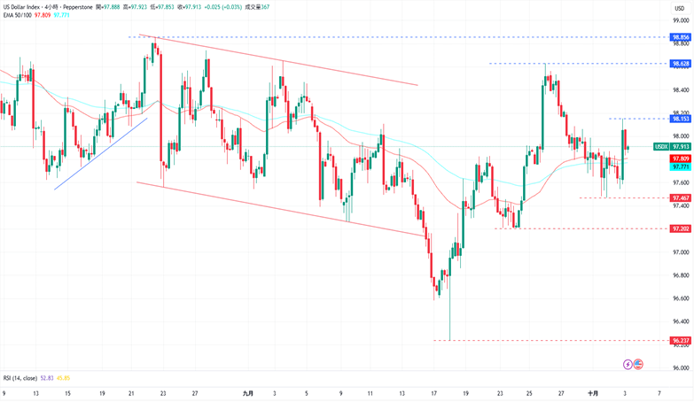 CPT Markets分析师指出,美元指数在97.467水平获得支撑后大幅反弹至EMA50上方,目前由于价格仍持续形成更高的低点,前景仍然保持看涨。上涨方面,美元指数目前的阻力为10月2日的高点98.153,再来是9月26日的高点98.628。下跌方面,美元指数目前的支撑为10月01日的低点97.467,接着是9月23日的低点97.202水平。