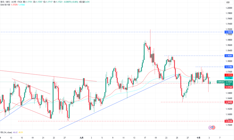 周四,欧元/美元下跌至1.17151美元。欧洲央行管委卡扎克斯周四表示,目前的利率水平处于「非常适宜」的位置,若无进一步冲击,欧洲央行利率可维持现状。经济数据方面,欧元区8月失业率为6.3%,高于预期以及前一个月的6.2%。美元方面,受美国政府停摆影响,当周失业金申请人数将延迟公布,包括非农就业在内的主要经济数据也将暂停发布。此前参议民主党议员沃伦周二曾呼吁政府周五「如期」发布就业数据。展望后市,周五美国经济日程将公布9月标普全球服务业PMI终值以及ISM非制造业PMI,而欧元区将公布9月服务业PMI终值以及8月PPI月率。