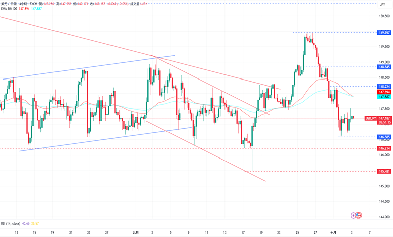 周四,美元/日元上涨至147.256日元。在日本方面,日本央行副行长内田真一周四表示,如果经济和物价走势符合预期,日本央行预计将继续升息。另一方面,执政的自民党将在本周末选举新党魁,而这场选举实际上将决定日本下一任首相,因此市场将关注对日元的影响。美元方面,受美国政府停摆影响,当周失业金申请人数将延迟公布,并且在政府停摆期间,包括非农就业在内的主要经济数据也将暂停发布。经济数据方面,美国9月挑战者企业裁员人数为5.4064万人,前值为8.5979万人。展望后市,周五美国经济日程将公布9月标普全球服务业PMI终值以及ISM非制造业PMI,而日本则将公布8月失业率。