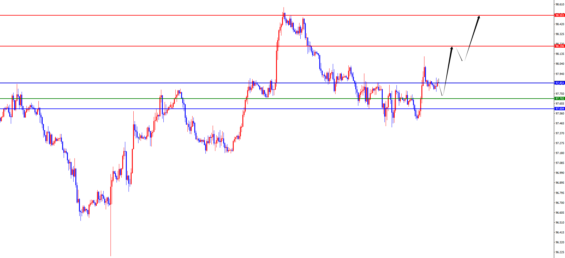 美指97.70-80区间多,防守5美金,目标98.20-98.50