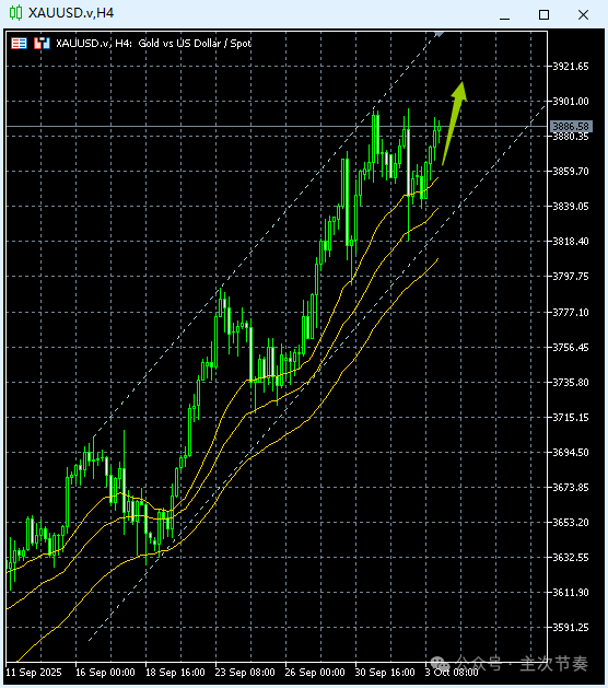 Inception: 2025-10-5近期黄金的上涨过程,在图中上涨通道内比较规范,值得参考。最近几天的高位震荡,一方面能保持在高位没有快速跌落,就表明涨势还没有结束,多方人气依然在形成很好的支撑效果。另一个方面,这几天的震荡过程有扩张形态迹象,对于黄金多头而言,本周初直接向上拉升突破3900是最佳结果,一旦再次受阻下落,就会进一步完善扩张形态,引发的回调就可能比较深了。这个变化很可能就发生在明天周一:冲到3900以上,看能不能站稳(如果没站稳,也要看整体还能不能保持在高位)。这会直接影响到接下来几天的发展线路。使用说明:
