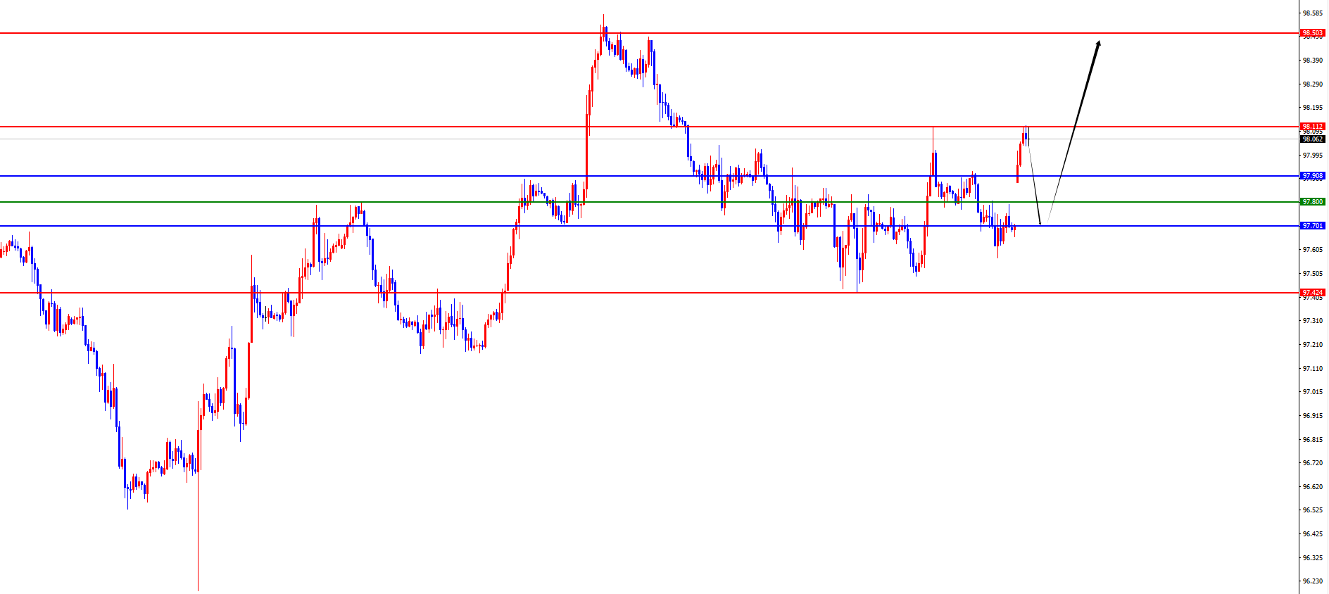 美指97.70-80区间多,防守5美金,目标98.20-98.50