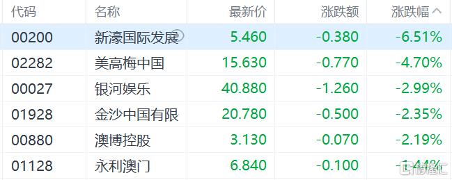 博彩股跌幅居前,新濠国际发展跌超6%,美高梅中国跌超4%,银河娱乐、金沙中国、澳博控股跌超2%。