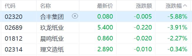 纸业股走低,合丰集团跌超5%,玖龙纸业跌超3%,晨鸣纸业跌超2%。