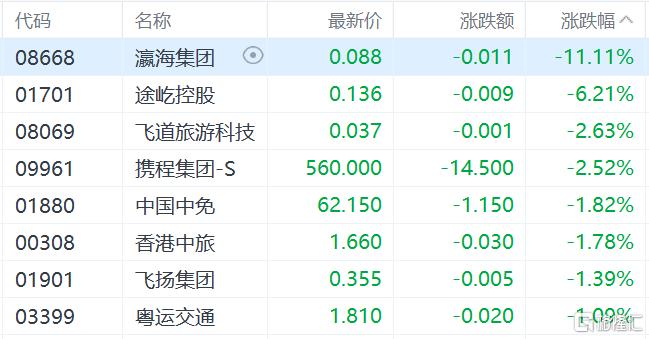 旅游股表现弱势,瀛海集团跌超11%,携程集团跌超2%,中国中免、香港中旅、粤运交通跟跌。