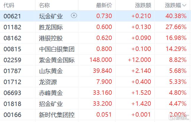 黄金及贵金属股大涨,坛金矿业涨超40%,胜龙国际涨超27%,紫金黄金国际涨超8%,山东国际、赤峰黄金、招金矿业跟涨。
