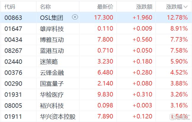 加密货币概念表现强势,OSL集团涨超12%,博雅互动涨超7%,云锋金融、国富量子、华检医疗等跟涨。