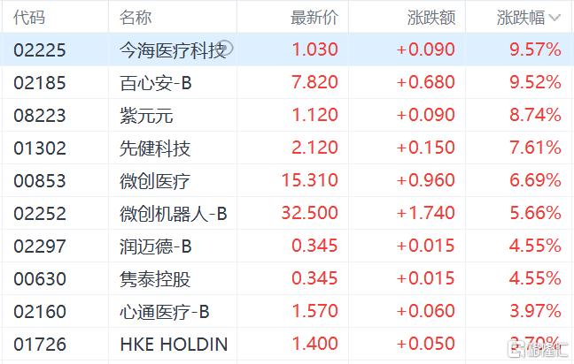 医疗设备及用品股涨幅居前,今海医疗科技、百心安-B涨超9%,先健科技涨超7%,微创医疗、润迈德-B等跟涨。