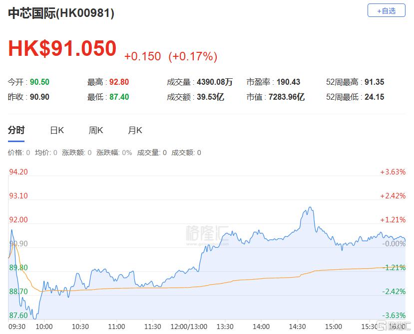 中芯国际午后转涨,一度涨超1%触及92.8港元,股价续创历史新高,H股市值一度突破7300亿港元,年内累涨186%。