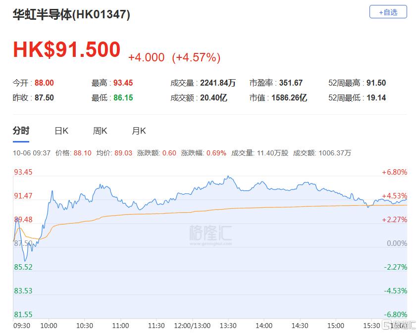 华虹半导体收涨4.57%,报91.5港元,盘中创历史新高,H股市值一度突破1600亿港元,年内累涨322%。