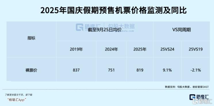 因此,国内外热门航线的机票价格也水涨船高,航班管家数据显示,截止9月25日,国庆假期的国内经济舱平均票价为819元,同比上涨9.1%。