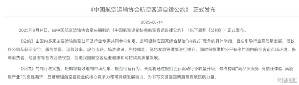 8月14日,中国航空运输协会牵头编制的《中国航空运输协会航空客运自律公约》正式发布,倡导各企业严格遵守价格法、反不正当竞争法等,杜绝低于成本价倾销、虚假宣传等恶意竞争行为。