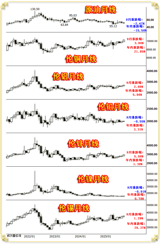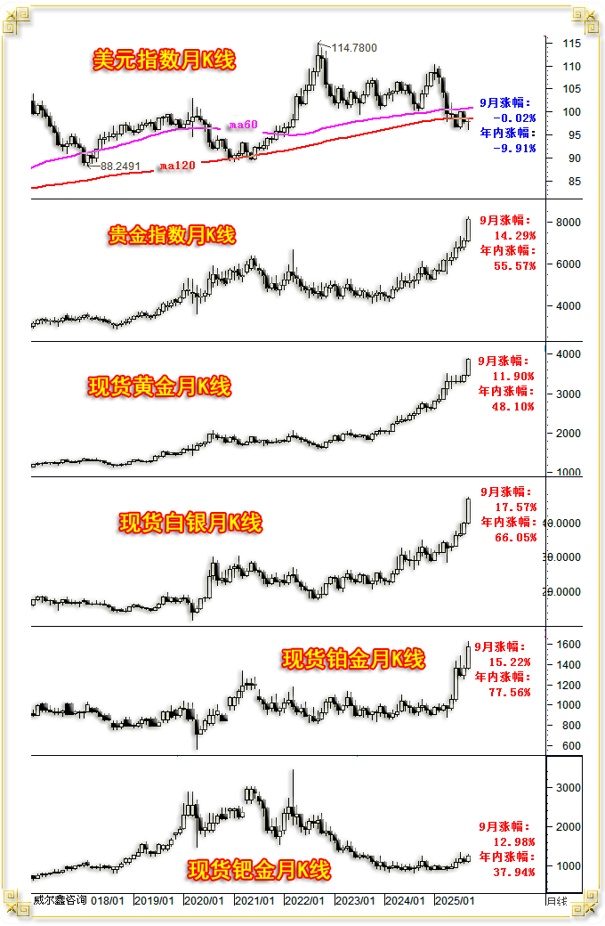 综合对比观察,在美元指数熊市氛围中,无论九月,还是年内,贵金属(金银铂钯)市场表现可谓光辉灿烂。但原油与基本金属并没借弱势美元起舞,若美元后市破位下行,商品市场可能起舞“补涨”,就像2025年银钯铂相较于2024年黄金强势的补涨逻辑一样。