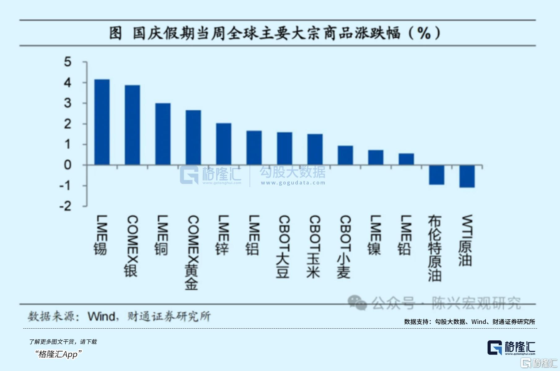 有色金属均出现不同程度的上涨,其中LME锡领涨,上涨4.2%,铅、铜、铝、锌和镍均有不同程度的上涨。而贵金属方面,金价连续7周上涨超3%。假期期间COMEX黄金上涨2.7%,COMEX白银上涨3.9%。
