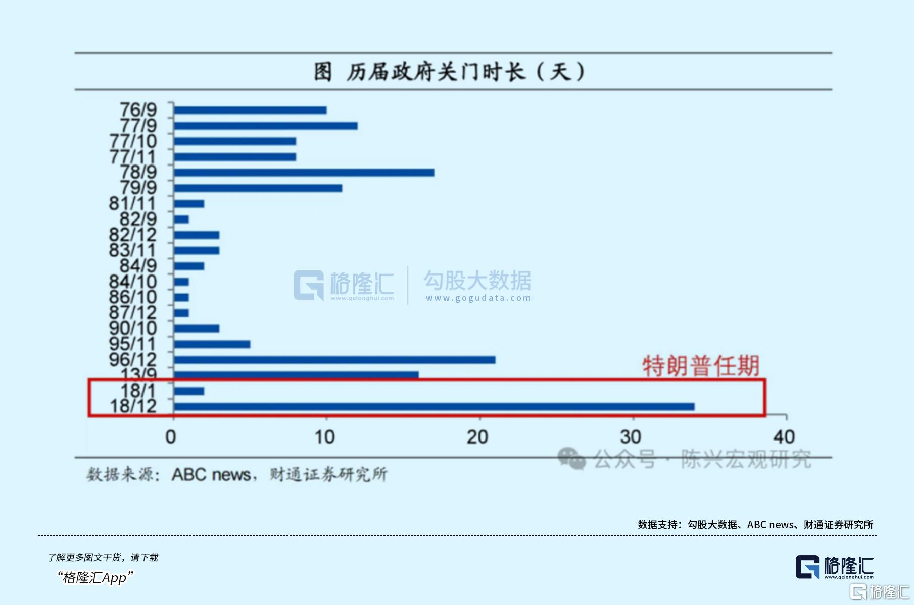 从历史上看,1976年以来美国政府停摆平均持续8天,最长是35天,在特朗普上届任期发生。也正是那次停摆期,金价周涨幅达到2.5%。