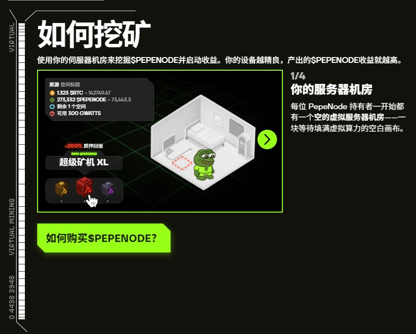 参与者使用PEPENODE代币购买节点,每个节点都具有独特的属性。玩家可以在个人服务器机房中自由布局这些节点,以组建最优的meme币挖矿数组。系统可在任何时间扩展、调整或升级,赋予玩家对收益生成的完全掌控。