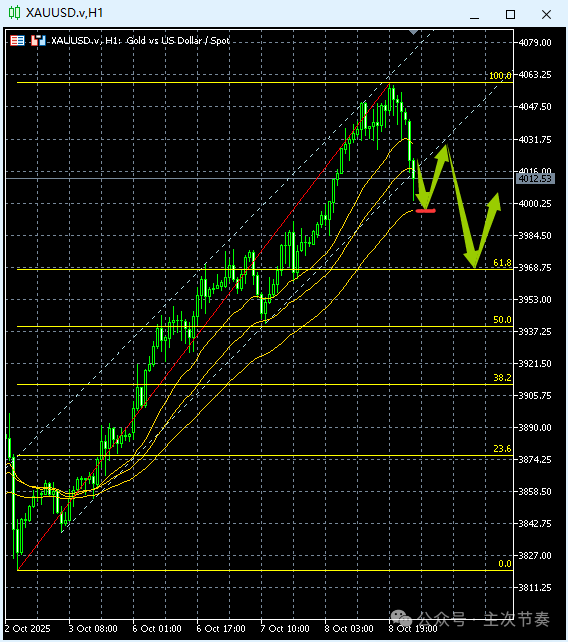 一句话看懂黄金Gold:大幅突破4000,短线回调初现,看成突破后的回抽巩固过程。