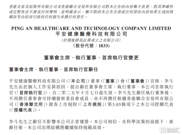 十月伊始,平安好医生(01833.HK)发布公告,李斗先生因个人工作安排辞任公司董事会主席、执行董事、首席执行官,现任平安集团联席首席执行官、平安好医生非执行董事郭晓涛将兼任该公司董事会主席一职,委任何明科为公司首席执行官、执行董事,自公告之日起生效。
