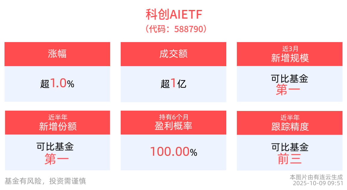 截至2025年10月9日 09:51,上证科创板人工智能指数强势上涨1.28%,成分股芯原股份上涨9.40%,澜起科技上涨5.21%,虹软科技上涨2.68%,道通科技,寒武纪等个股跟涨。科创AIETF(588790)上涨1.02%,最新价报0.89元。拉长时间看,截至2025年9月30日,科创AIETF近2周累计上涨2.56%。