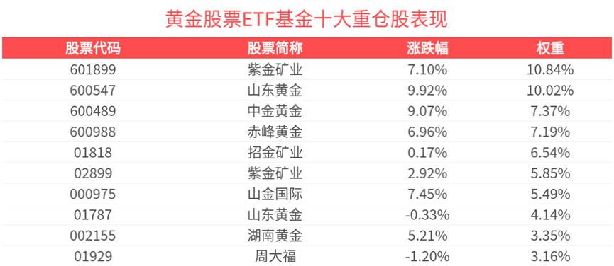 数据显示,截至2025年9月30日,中证沪深港黄金产业股票指数(931238)前十大权重股分别为紫金矿业(601899)、山东黄金(600547)、中金黄金(600489)、招金矿业(01818)、赤峰黄金(600988)、山金国际(000975)、紫金矿业(02899)、山东黄金(01787)、铜陵有色(000630)、湖南黄金(002155),前十大权重股合计占比68.2%。