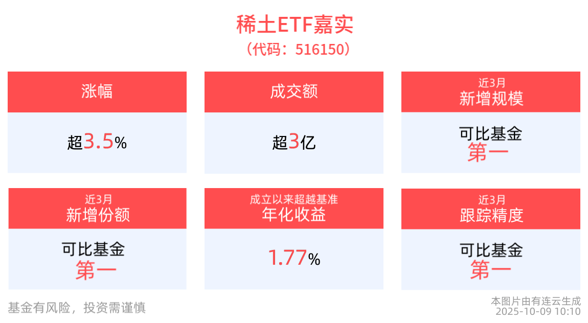 截至2025年10月9日 10:10,中证稀土产业指数强势上涨3.76%,成分股安泰科技上涨10.03%,九菱科技上涨8.69%,金风科技上涨7.15%,包钢股份,三川智慧等个股跟涨。稀土ETF嘉实(516150)上涨3.59%。