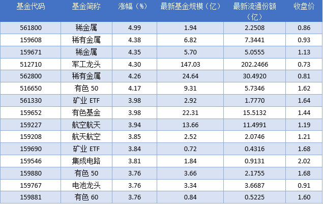 根据巨灵财经统计的数据显示,2025年09月30日场内ETF基金中稀金属 (561800)领涨,涨幅为4.99%,排名靠前的稀有金属(159608)、稀金属(159671)、军工龙头(512710),涨幅分别为4.38%、4.35%、4.30%。