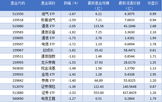 下跌方面,2025年09月30日跌幅最大的是油气ETF (513350),跌幅达到2.67%。排名靠前的标普油气(159518)、通信ETF (515880)、通信设备(159583),跌幅分别为2.59%、2.05%、1.82%。