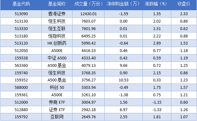 从成交量上来看,2025年09月30日成交量最大的是香港证券(513090),成交量为12430.01万份。排名靠前的恒生科技(513130)、恒生互联(513330)、恒指科技(513180),成交量分别为7603.07万份、7601.96万份、6495.25万份。