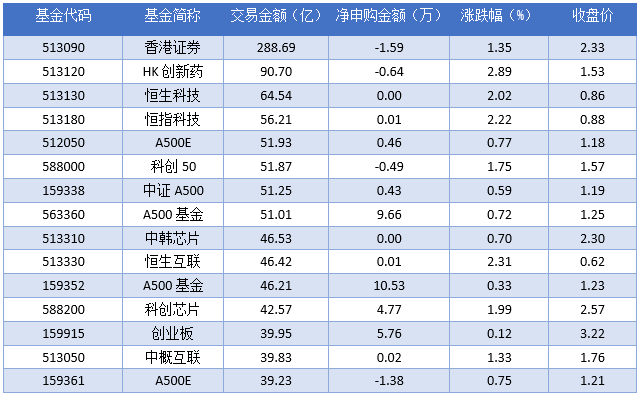 从成交金额上来看,2025年09月30日成交额最大的是香港证券(513090),交易金额288.69亿元。排名靠前的HK创新药(513120)、恒生科技(513130)、恒指科技(513180),成交额分别为90.70亿元、64.54亿元、56.21亿元。