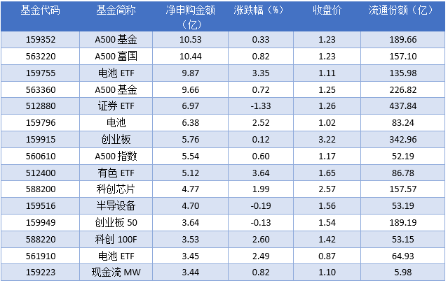 细分到资金流动情况上来看,2025年09月30日净申购金额最大的为A500基金(159352),当日净申购金额为10.53亿元。排名靠前的A500富国(563220)、电池ETF(159755)、A500基金(563360),申购金额为10.44亿元、9.87亿元、9.66亿元。