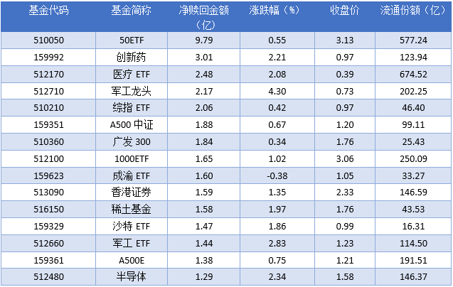 资金流出方面,2025年09月30日净赎回金额最多的是50ETF (510050),赎回金额9.79亿元。排名靠前的创新药(159992)、医疗ETF (512170)、军工龙头(512710),赎回金额分别为3.01亿元、2.48亿元、2.17亿元。