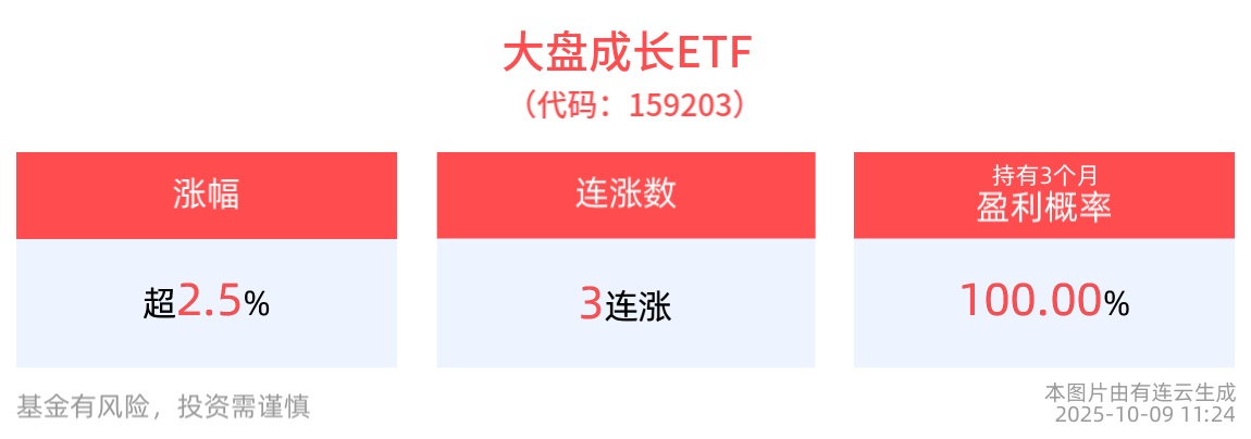 截至2025年10月9日 11:24,国证大盘成长指数强势上涨2.17%,成分股中微公司上涨10.53%,特变电工上涨10.00%,山东黄金上涨9.99%,赣锋锂业,洛阳钼业等个股跟涨。大盘成长ETF(159203)上涨2.58%, 冲击3连涨。最新价报1.39元。拉长时间看,截至2025年9月30日,大盘成长ETF近2周累计上涨2.65%。