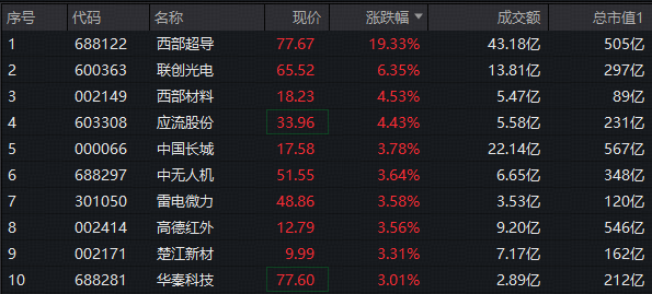 成份股方面,可控核聚变概念股继续活跃,西部超导触及20CM涨停,联创光电涨超6%,应流股份涨超5%。权重股中国船舶、光启技术、航发动力均飘红。