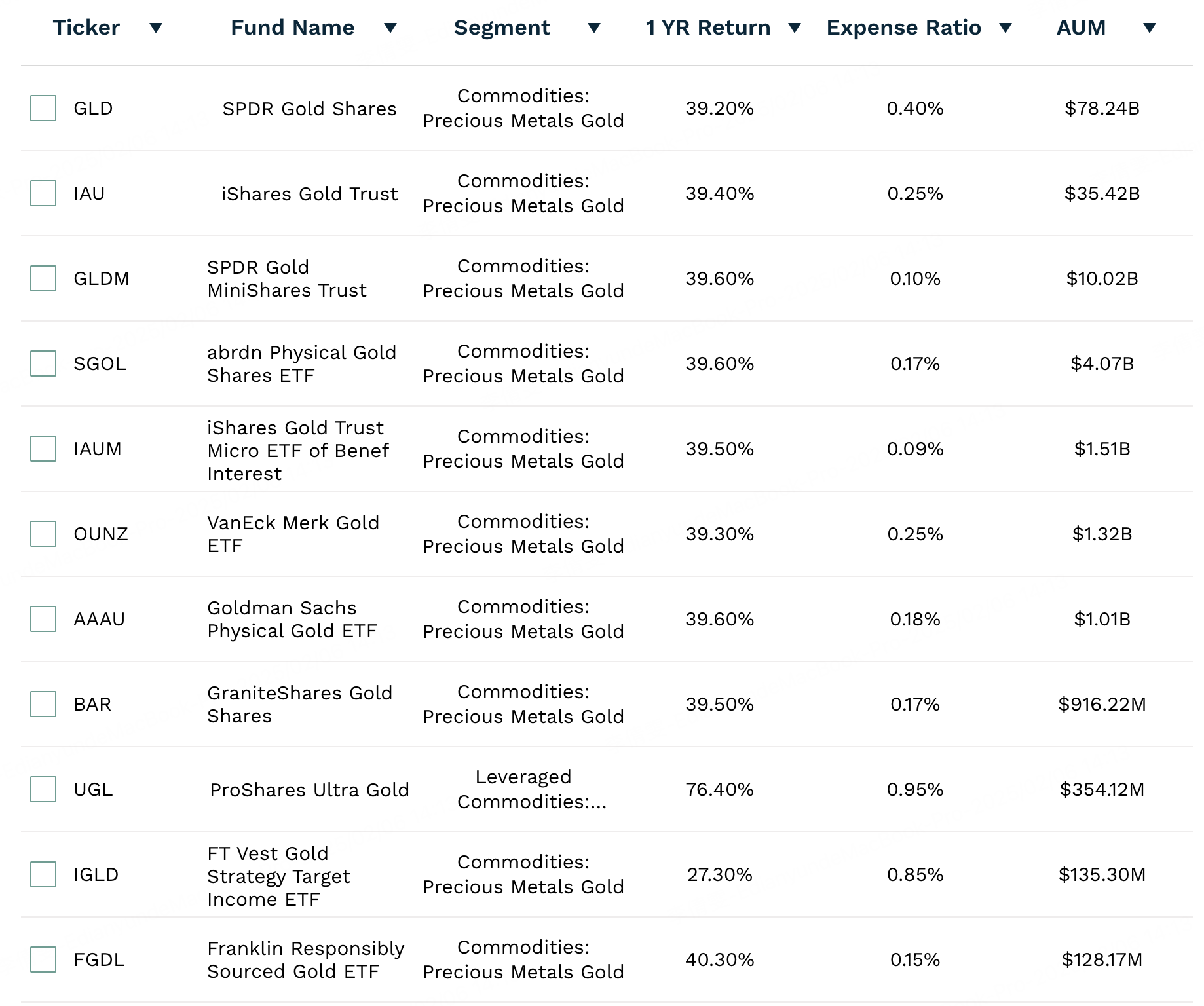 面对这轮黄金大行情,最直接的方式是投资黄金ETF。比如SPDR的 $SPDR黄金ETF(GLD)$、贝莱德的 $黄金信托ETF(iShares)(IAU)$ 都以实物黄金为支撑,费用低、流动性强,适合长期持有。如果想降低资金门槛, $SPDR Gold MiniShares Trust(GLDM)$ 是个不错的低成本版本。而想短线放大收益的投资者,可以关注杠杆类产品,如 $二倍做多黄金ETF(ProShares)(UGL)$ UGL ,但持仓过夜风险较高。