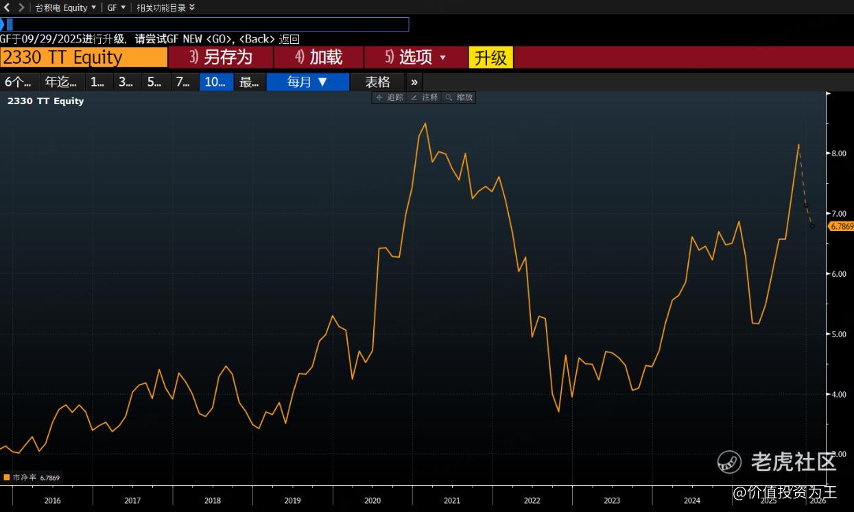 从估值上看,台积电市净率为8.15倍,正在逼近2021年大牛市时9.4倍的最高值: