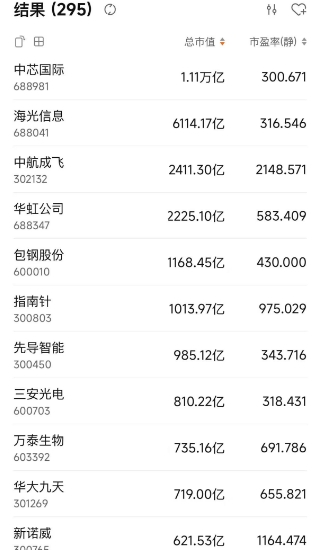 截至目前,中芯国际、海光信息、中航成飞、华虹公司、包钢股份、指南针等两融标的静态市盈率均超过300倍。巧合的是,中芯国际静态市盈率刚刚跨过300倍门槛。目前,宜安科技静态市盈率达到16930倍,排在两融标的第一,赛诺医疗以7025倍紧随其后,康美药业以3290.42倍排在第三。