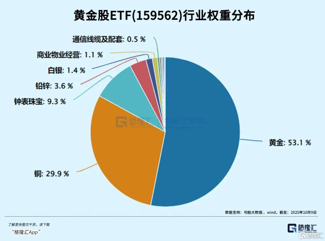 黄金股ETF是股票型ETF,投资于在港A股上市的黄金相关公司,其53.1%持仓集中于黄金开采龙头企业,29.9%持仓集中于铜业龙头企业;权重股聚焦金矿股,如紫金矿业、山东黄金、中金黄金等,也包含少部分珠宝零售公司,如老铺黄金、周大福等。