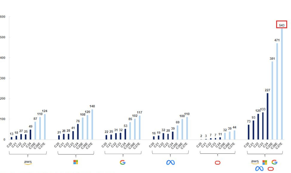什么意思?先看一组数据。高盛最新预测,到2027年,美国几大科技巨头要砸出1.4万亿美元搞AI基建,是2022–2024年总投入的将近三倍。什么是AI基建?简单说,就是建“AI工厂”:得有芯片、有内存、有数据中心、有服务器、有网络设备、有电力冷却系统……没有这些,再强的模型也跑不起来。