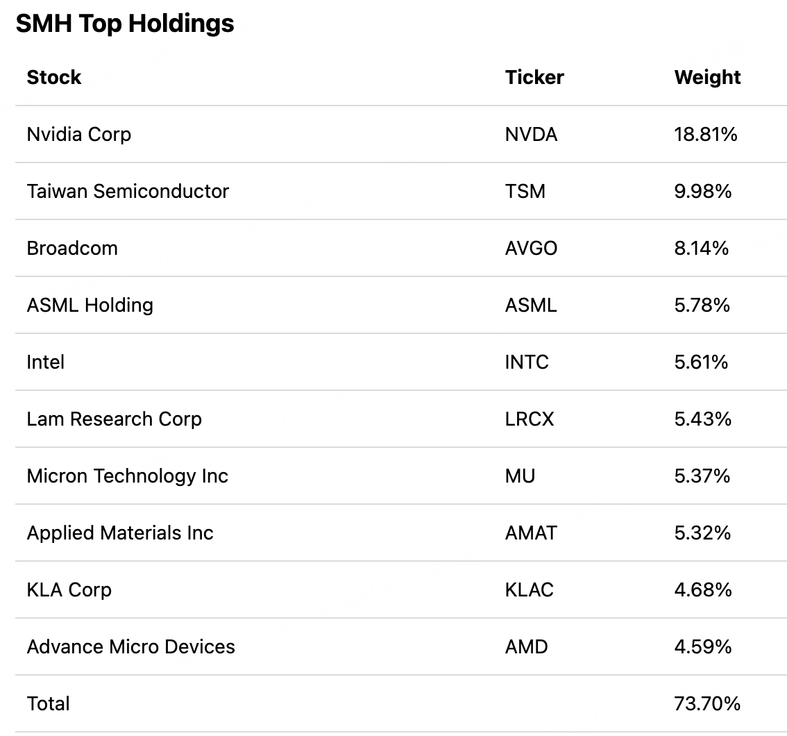 $半导体指数ETF-HOLDRs(SMH)$ 是目前规模最大的芯片ETF,是最典型的“头部集中型”,英伟达一个股就占快20%,配上台积电、 $博通(AVGO)$ 、 $阿斯麦(ASML)$ 、英特尔、AMD 等重磅选手。它走势贴近整个AI芯片行业,是非常适合当底仓的选择。2025年到现在已经涨了42%