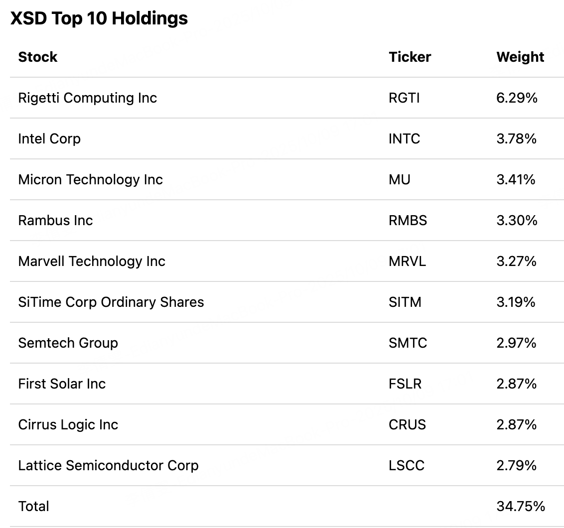 $SPDR S&P Semiconductor ETF(XSD)$ 更分散,采取等权重设计,中小市值公司权重也不小。像 $Rigetti Computing(RGTI)$ (量子计算)、 $SiTime Corp(SITM)$、 $先科电子(SMTC)$ 这些成长股都有不错比重。所以XSD的波动会更大一些,涨起来猛,但需要能承受一定回撤。适合想搏一把弹性的朋友