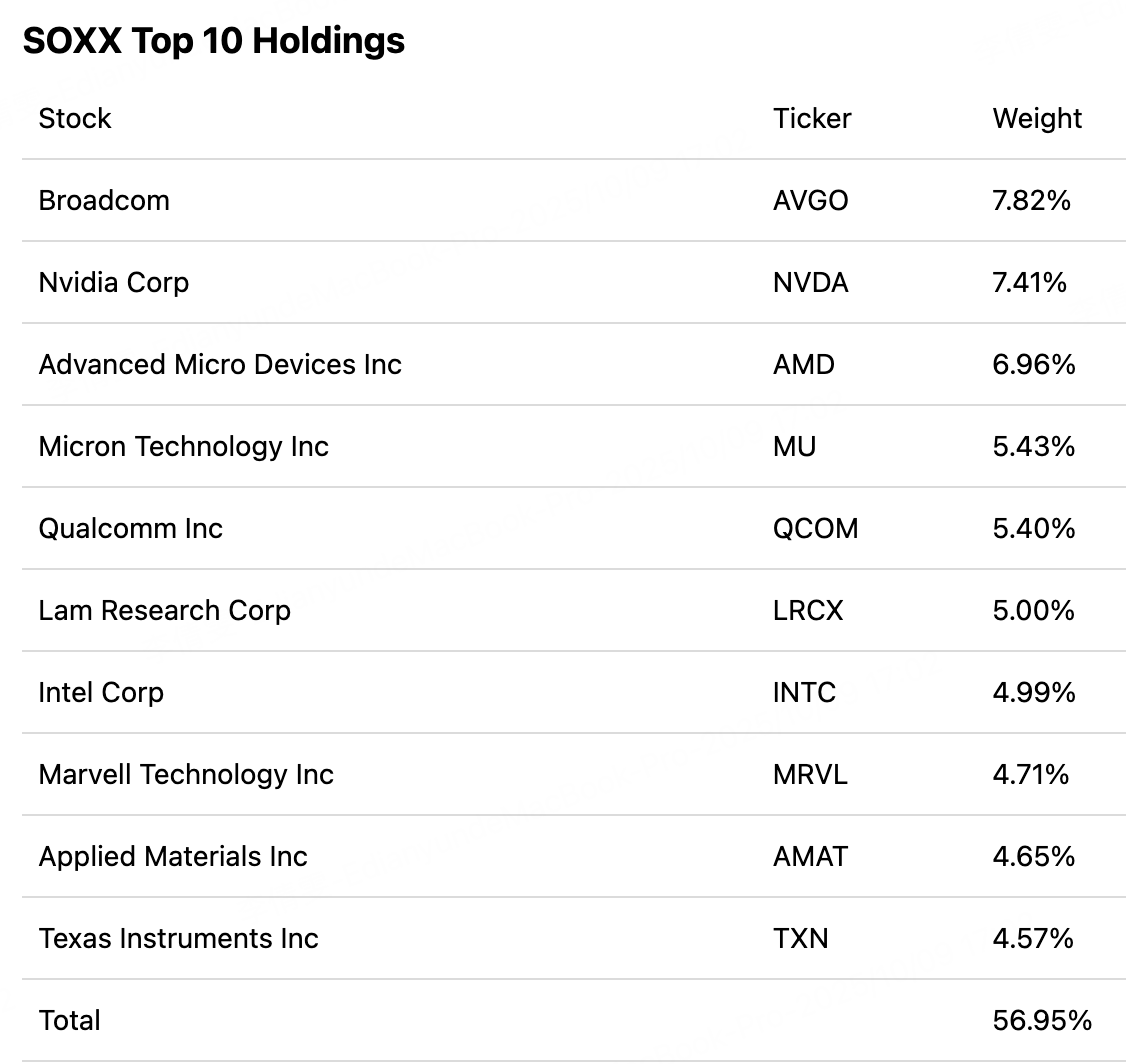 $iShares费城交易所半导体ETF(SOXX)$ 是稳健派,属于平衡布局。它不会像SMH那样集中重仓英伟达,也不像XSD那么激进,更偏长期配置。AMD、MU、QCOM、TXN这些传统芯片巨头也都在里面,适合做“压舱石”。