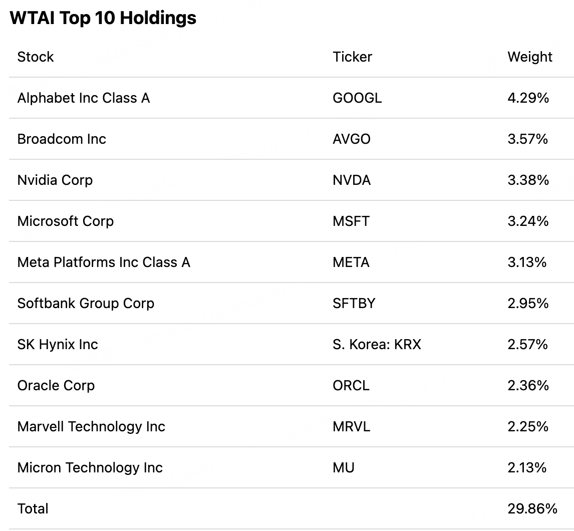 $WisdomTree Artificial Intelligence and Innovation Fund(WTAI)$ 是覆盖面最广的一只。它不仅投芯片,还投平台,比如微软、谷歌、Meta、Oracle、Broadcom、SK海力士,横跨了硬件+云+AI平台三大块。你可以理解为,它不只是卖“铁锹”(算力),还参与“挖金子”(AI业务)。如果你想一口气买下一条AI产业链,那WTAI是最省事的选择。