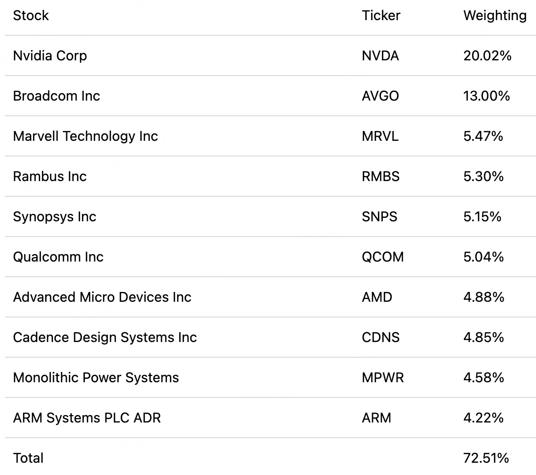 $VanEck Fabless Semiconductor ETF(SMHX)$ 则是专门投“芯片设计公司”,也就是我们常说的“Fabless”。这些公司不自己造芯片,但负责设计——比如英伟达、AMD、QCOM、Synopsys、Cadence、ARM。这类公司毛利高、技术壁垒强,在AI爆发期的弹性很大,适合做“加速器”。