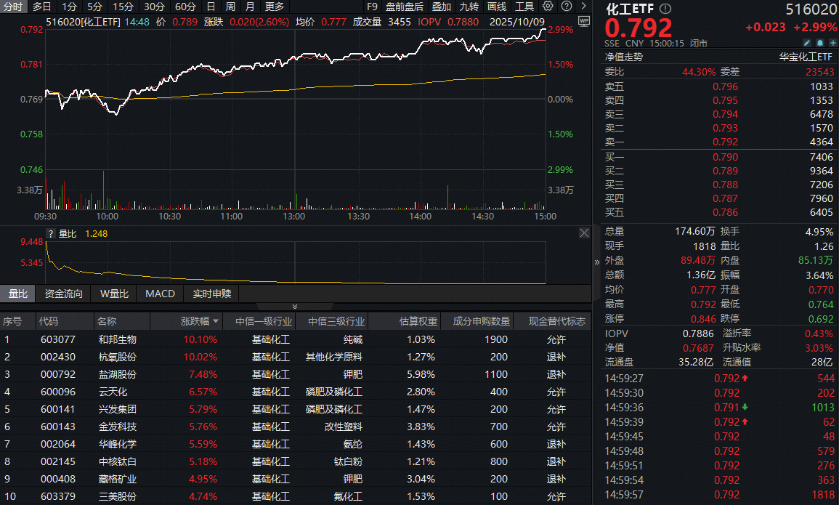 化工板块延续强势,反映化工板块整体走势的化工ETF(516020)全天几乎单边上行,截至收盘,场内价格涨2.99%,日线六连阳。