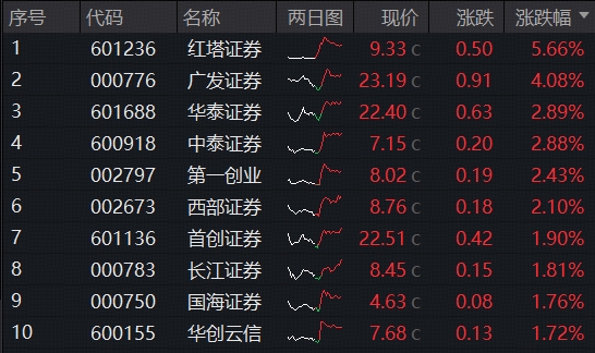 板块个股多数飘红,红塔证券领涨5%,广发证券涨超4%,华泰证券、中泰证券、第一创业、西部证券涨超2%,首创证券、中金公司等13股涨逾1%。